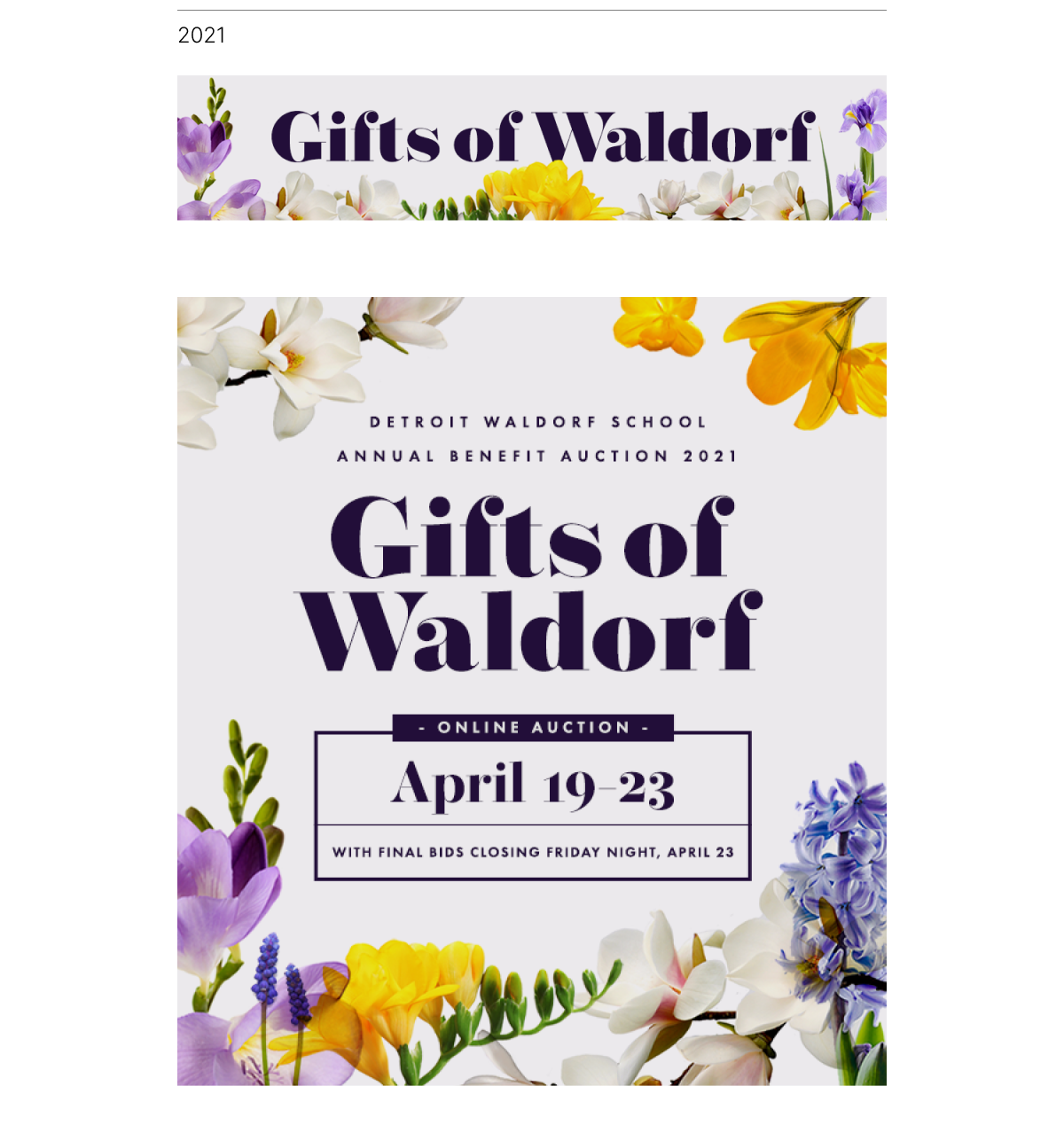 Designed marketing materials for the Detroit Waldorf School’s Annual Benefit Auction. Each year is an interpretation of the floral theme – a nod to the burst of flowers we see each spring. The benefits of this auction help the school community and ensure that DWS is financially accessible to all families through their Accessible Tuition Program.